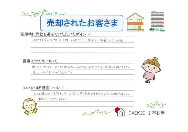 埼玉県北部の戸建て|DAIKICHI不動産(ダイキチ不動産) > お客様の声一覧 > 【売却】R・O様