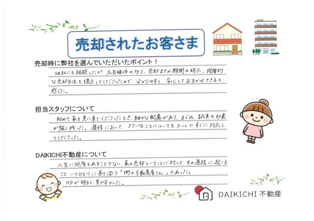 - 他社にも相談したが、広告媒体の多さ、売却までの期間の明示、段階的な売却方法を提示してくださったので、分かりやすく、安心しておまかせできると感じた。