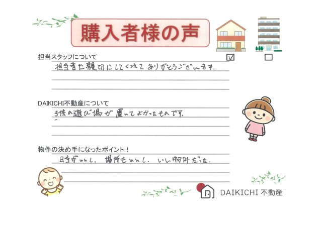 また、お引き渡しまでの限られた期間の中で、さまざまなお手続きに迅速にご対応いただきましたおかげで、スムーズにお引き渡しの日を迎えることができました。重ねて感謝申し上げます。