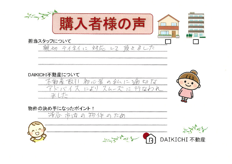 不動産取引初心者の私に適切なアドバイスによりスムーズに行われました。