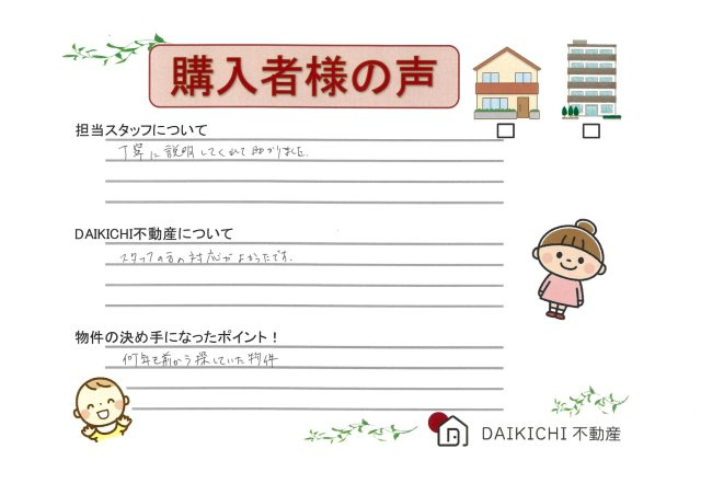 「丁寧に説明してくれて助かりました」とのお言葉を頂戴し、大変嬉しく思っております。何年も前から探していた物件のご縁に立ち会えたこと、また少しでもお力になれましたことを光栄に感じております。